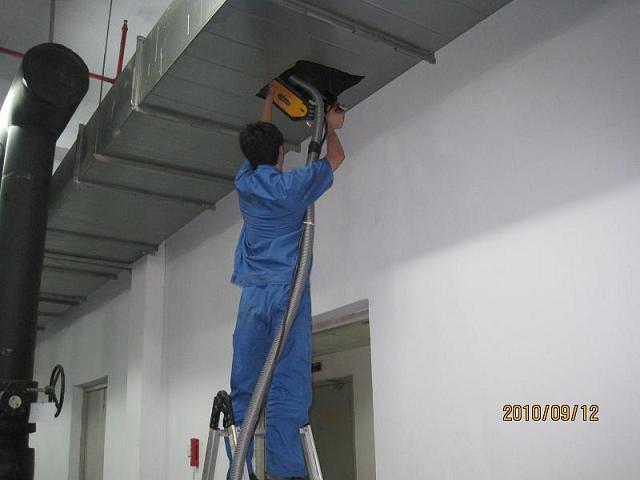 拆除各種風口 →專業(yè)單位測定風管內積塵情況→放入專用檢查頭→觀察風管內部情況,確定清洗方案(可制作光盤)→在需清洗的風管二頭放 置二個氣囊并于其中一邊開一個圓形工藝孔(或利用原有出風口),并把該孔與捕集器的吸入口用軟管聯(lián)接→再從另一口內(或利用原有出風口)放入風刀或振動鞭邊打松塵邊由捕集器同時把灰塵吸走→噴灑消毒劑→放入專用檢查頭觀察風管清洗后情況(可制作光盤)→專業(yè)單位測定風管清洗后情況 →安裝各種風口→出具清洗完工報告。